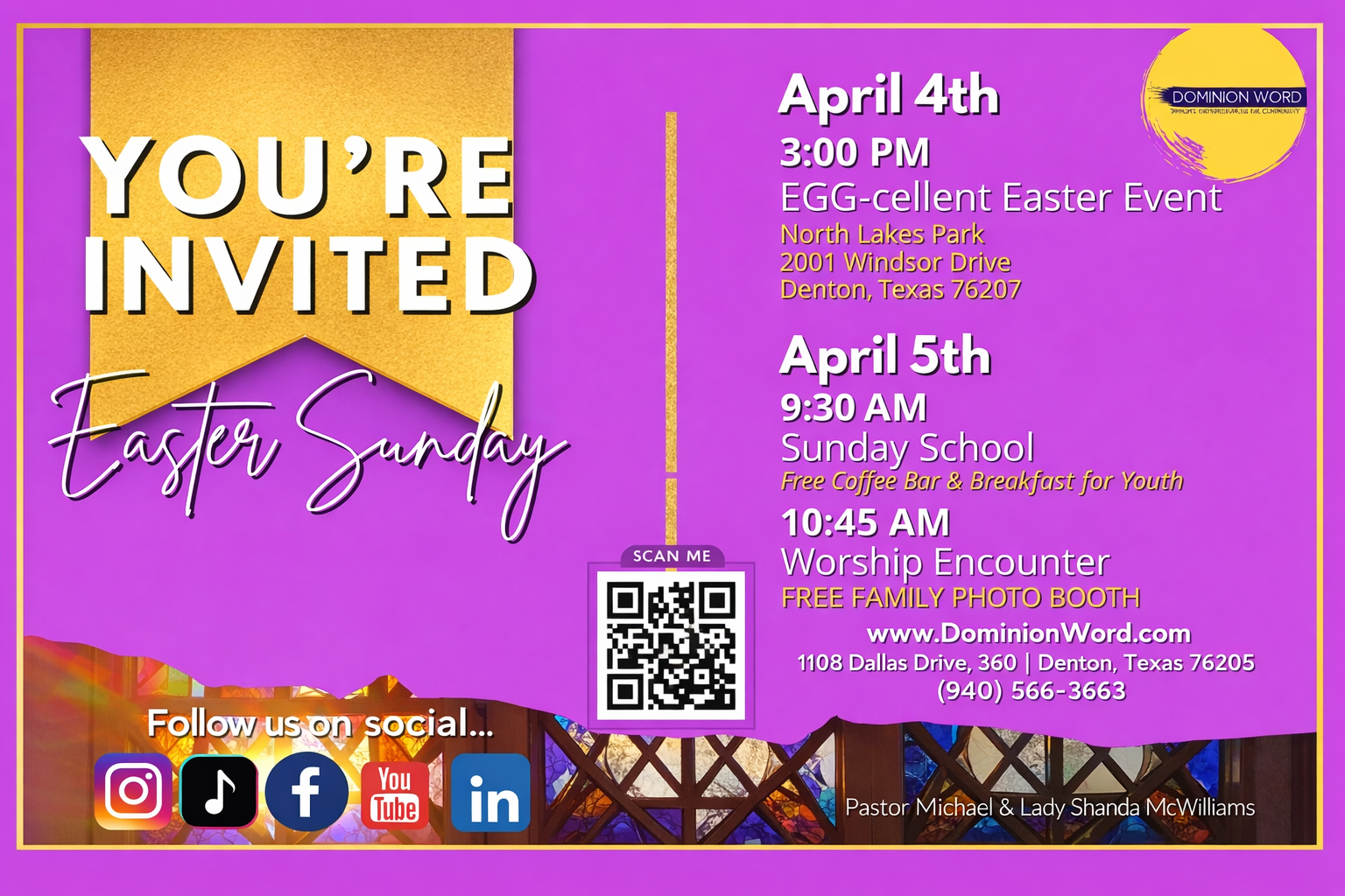 You’re invited to celebrate Easter with Dominion Word for a powerful and joy-filled weekend designed for the entire family. Kick things off on April 4 at 3:00 PM with our EGG-cellent Easter Event at North Lakes Park in Denton, Texas, where you can enjoy a fun, welcoming atmosphere and connect with others in the community. Then join us on April 5 for an uplifting Easter Sunday experience, beginning with Sunday School at 9:30 AM featuring a free coffee bar and breakfast for youth, followed by a dynamic Worship Encounter at 10:45 AM. Capture the moment with our free family photo booth and experience a day filled with hope, celebration, and the life-changing message of Jesus Christ.